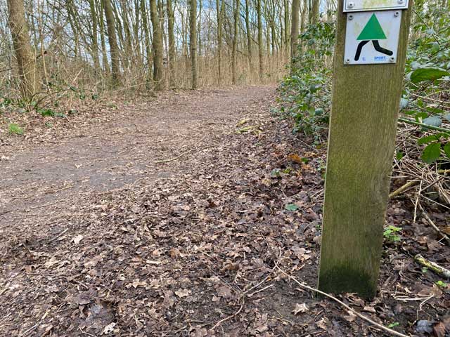Na het hek slingert een onverhard bospad zich tussen de kale bomen door. Ook de vogels hebben goede moed in deze betere weersomstandigheden. Ze fluiten erop los.