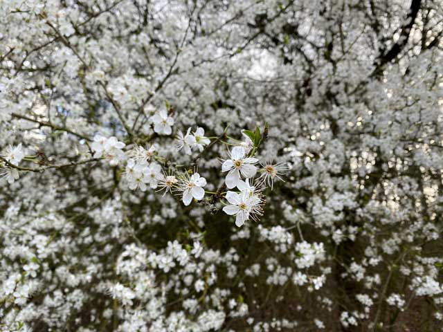 Kijk nou eens, een boom staat al helemaal in de witte bloesem. Lange stamperdraden schieten uit de witte bloemen naar voren. Dit zou een prunus kunnen zijn, maar zeker weten doe ik het niet.