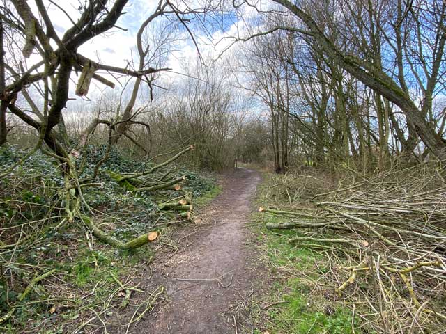 Het pad is weer een bospad geworden. Hier is het wat natter dan aan de andere kant van de plas. Een bruggetje brengt me over een overloop vanuit de waterplas. Langs de rand van het bospad, langs de modder, wandel ik verder. Al snel is het weer een droog wandelpad. Ook hier zijn er werkzaamheden geweest om afgewaaide takken van het pad te verwijderen.