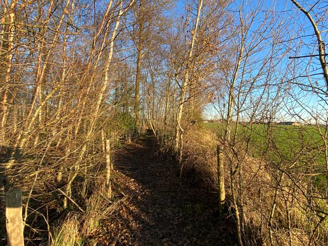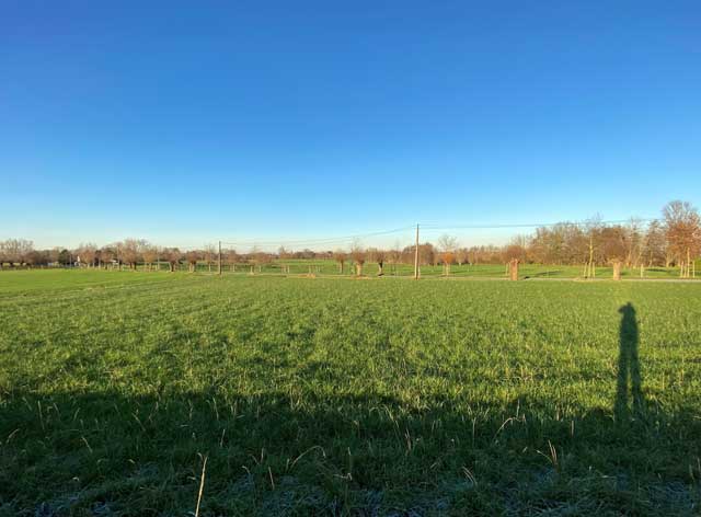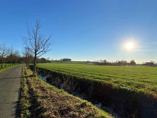 In de verte achter een rij wilgenbomen glooit het groen omhoog. Door een hekje gaat de wandelroute nu echt over een smal paadje tussen de akkers en weilanden door. Zelfs in december voel ik de warmte van de zon. Lange spinnendraden schitteren in de zon op het groene gras. Zoiets heb ik nog niet eerder gezien.